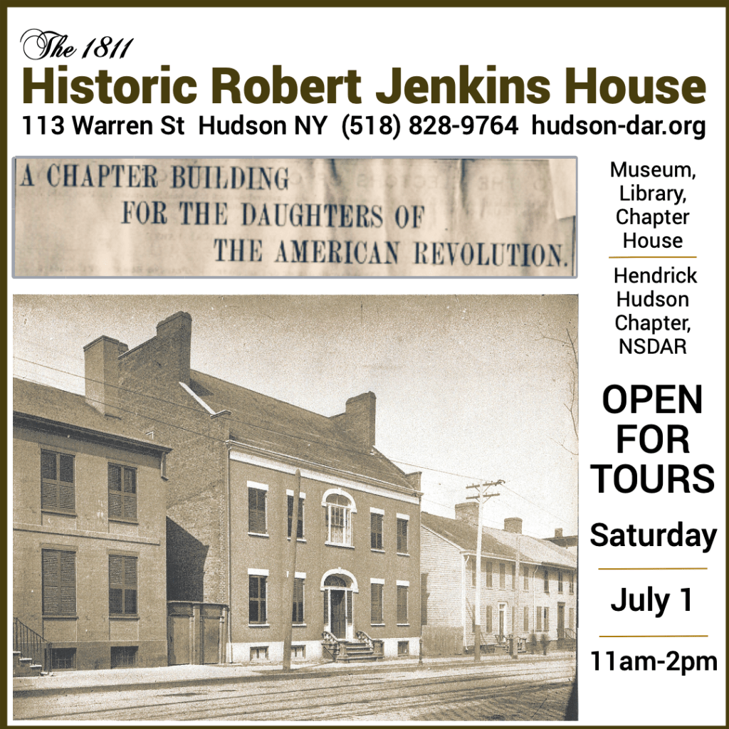 Tours–no appointment needed–at the Historic Robert Jenkins House at 113 Warren Street in Hudson are available on Saturday, July 1st, 11am-2pm. Located in an Historic District, the 1811 house is on the National Register of Historic Places as Nationally Significant. Since 1900 it has featured a museum of local “books, pictures, relics and curios.” The house’s full public library, the only one in the City of Hudson until 1959, is now a genealogical and historical library, open to the public for research by appointment.
