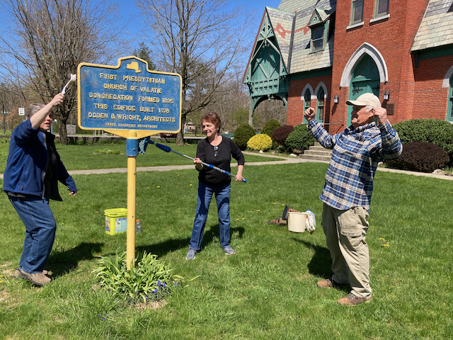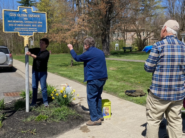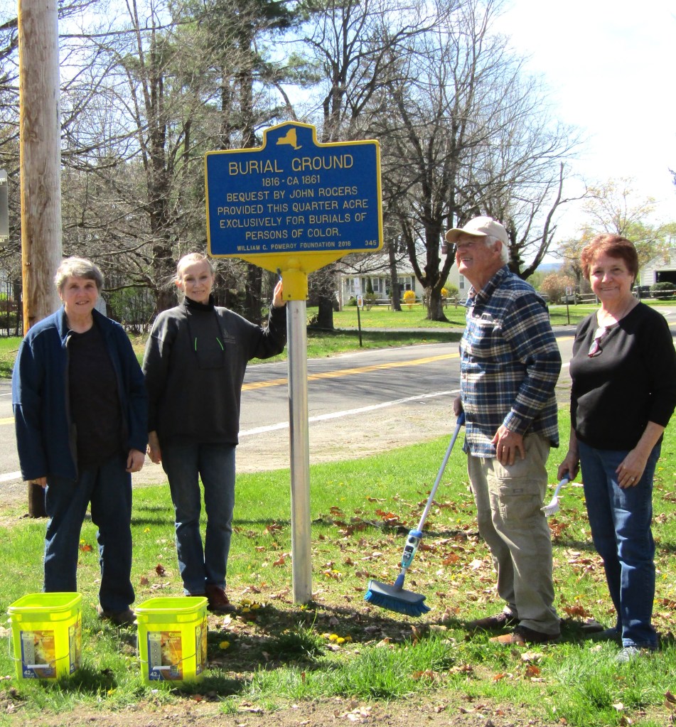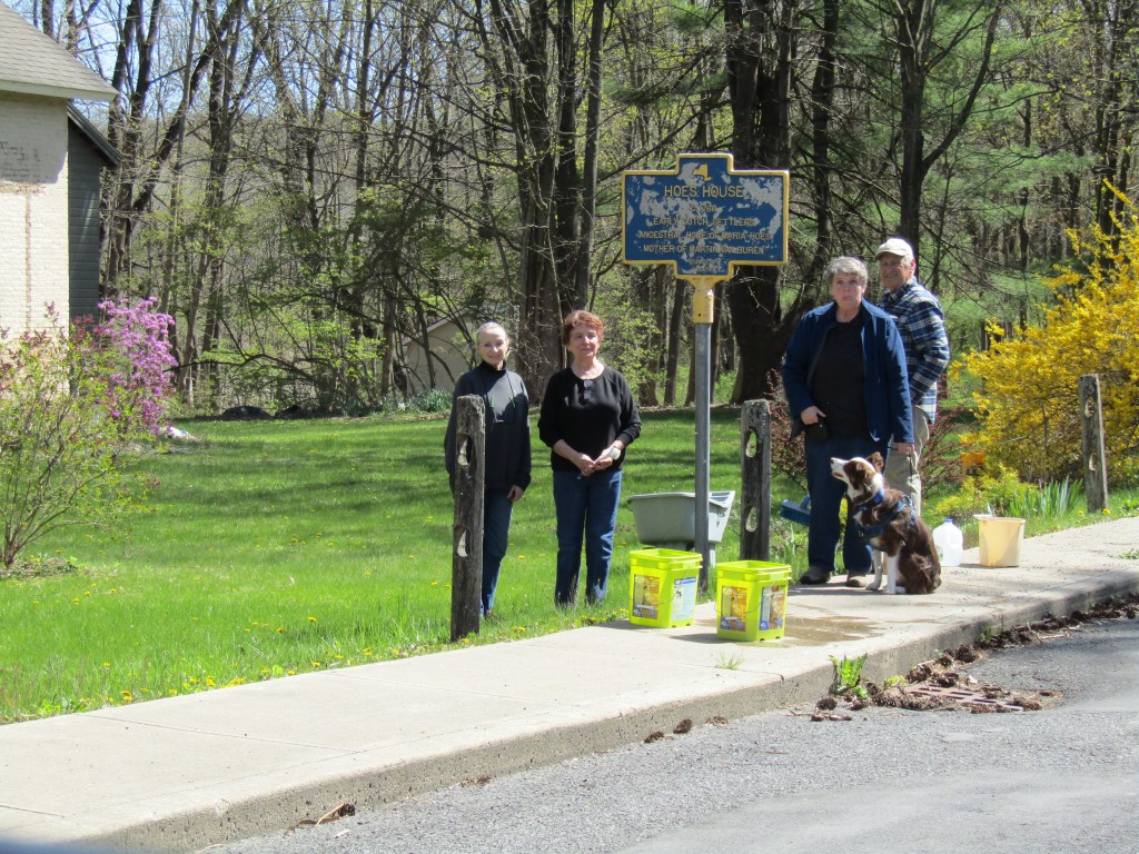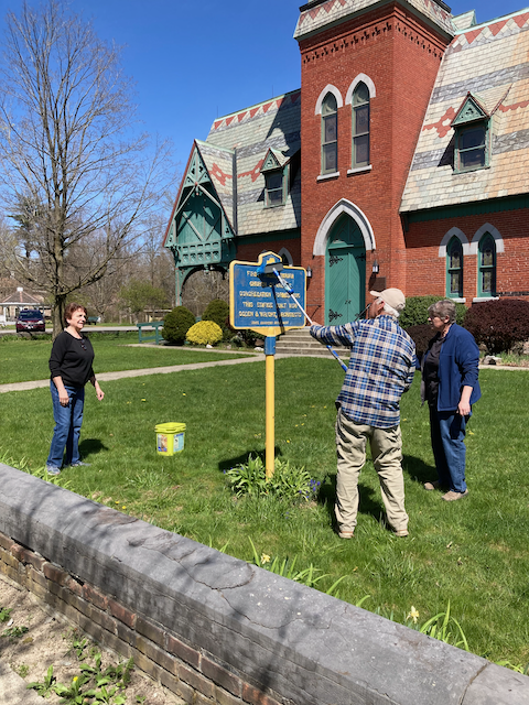 Three chapter members (one wielding a camera), two civic-minded friends, and Rydor the dog cleaned and tidied up five historic signs, marking the 1st Presbyterian Church, the Governor (Martin) Glynn Square, and the Hoes House (home of President Martin Van Buren’s mother), as well as two at the Persons of Color Burial Ground in Kinderhook.