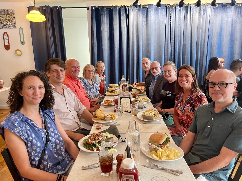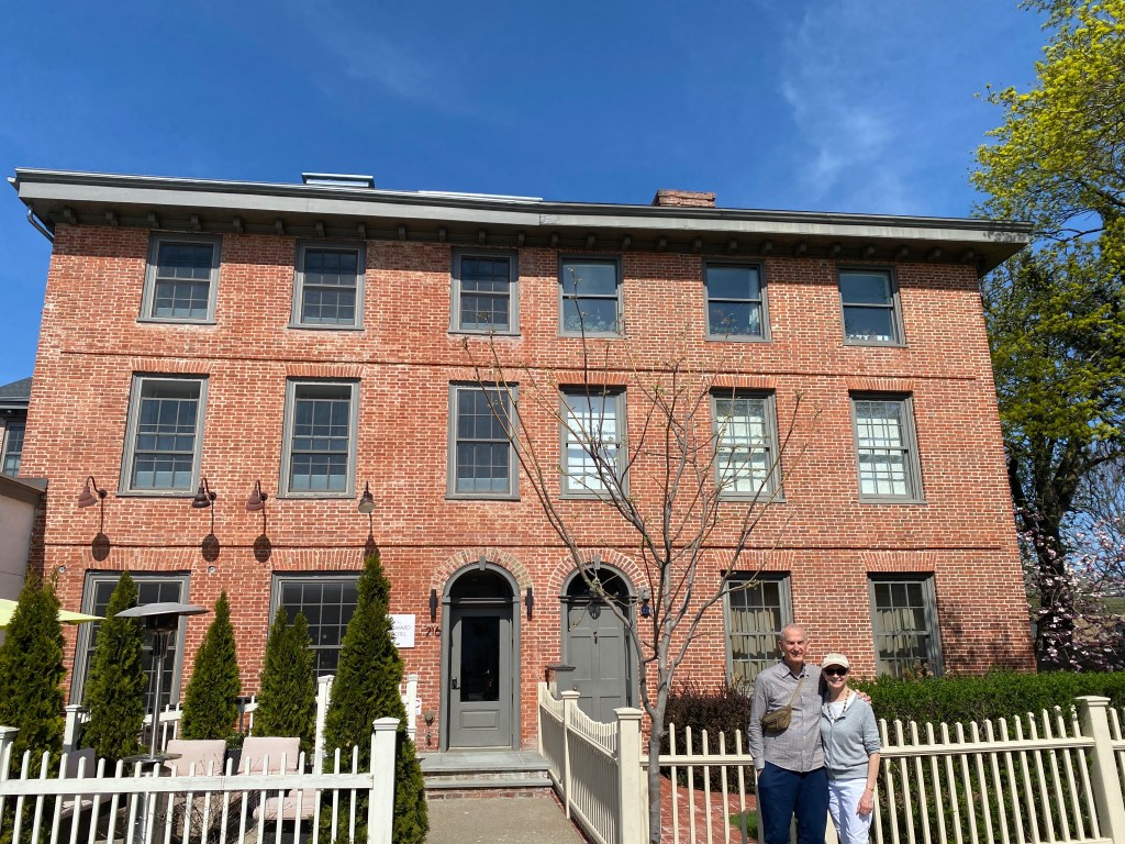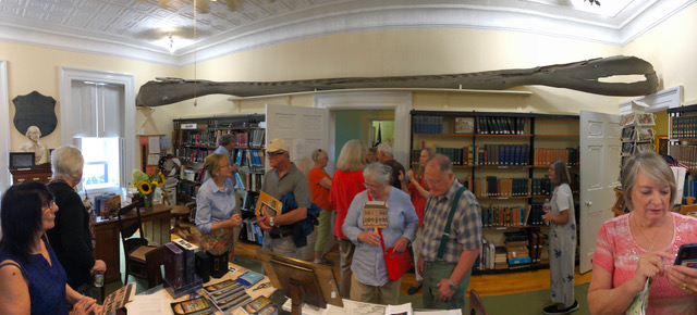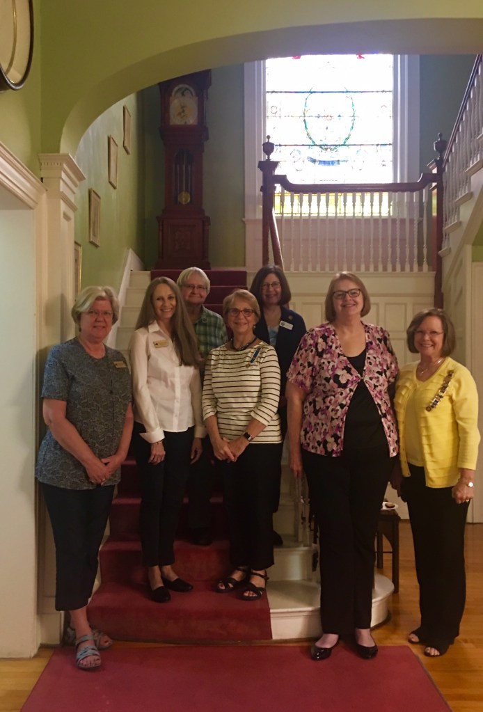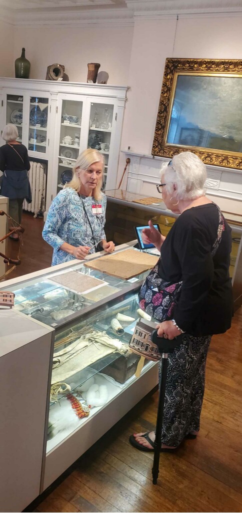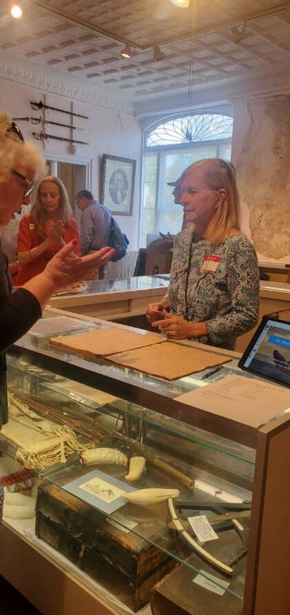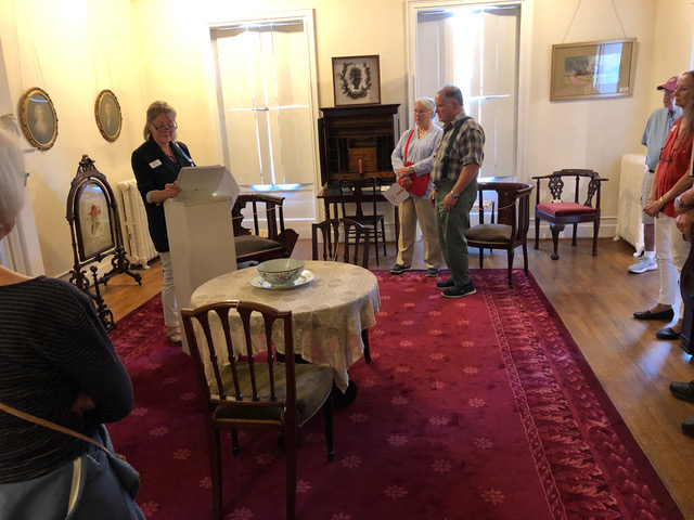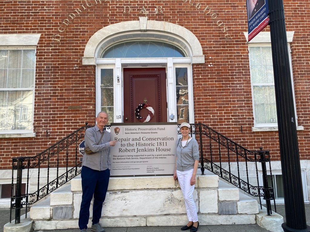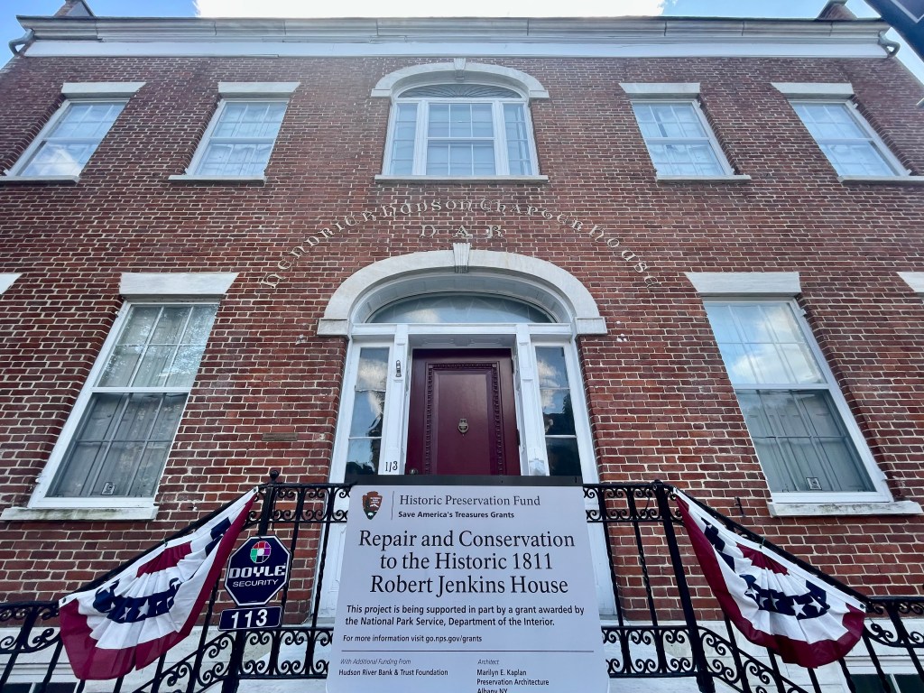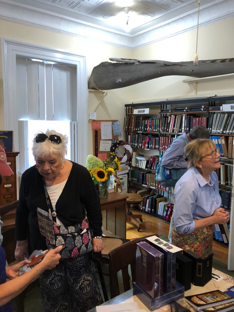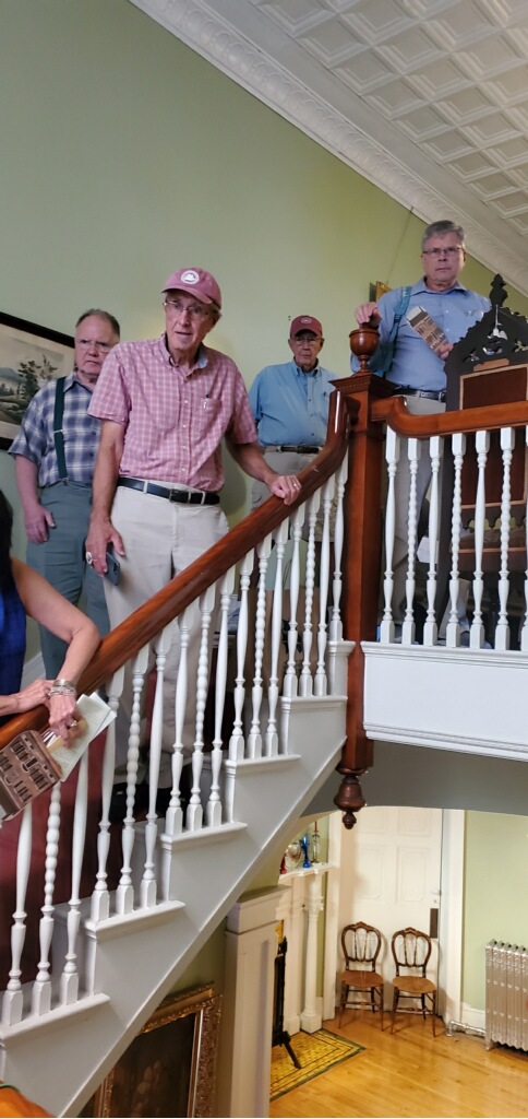 below: August and September 2023: Visit by Jacob Leisler Institute board of trustees. Visit by Descendants of Whaling Masters and by Thomas Jenkins descendant Mark Thompson and family, which included a tour of the Robert Jenkins House, a tour of the Plumb-Bronson House, and a Hudson Area Library talk by Carl Whitbeck entitled “Hudson and Its Whaling Roots.” The Descendants made generous gifts to the chapter’s capital campaign and its library.