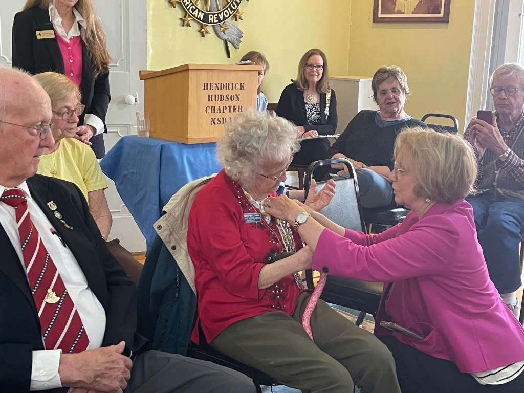 below: April 2023: Pinning an Honorary Regent at our Benefactor’s Birthday Party.