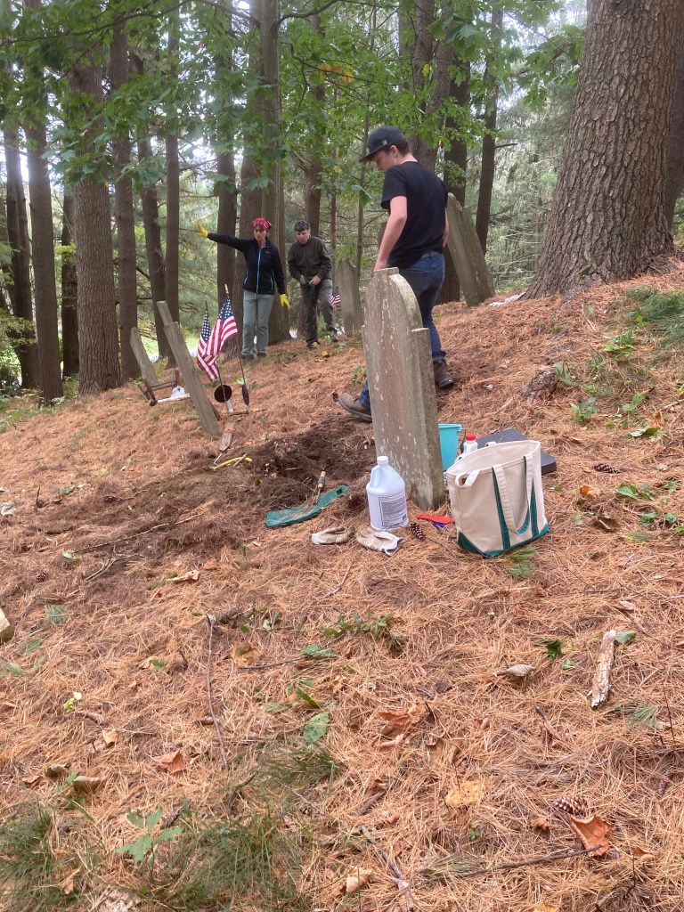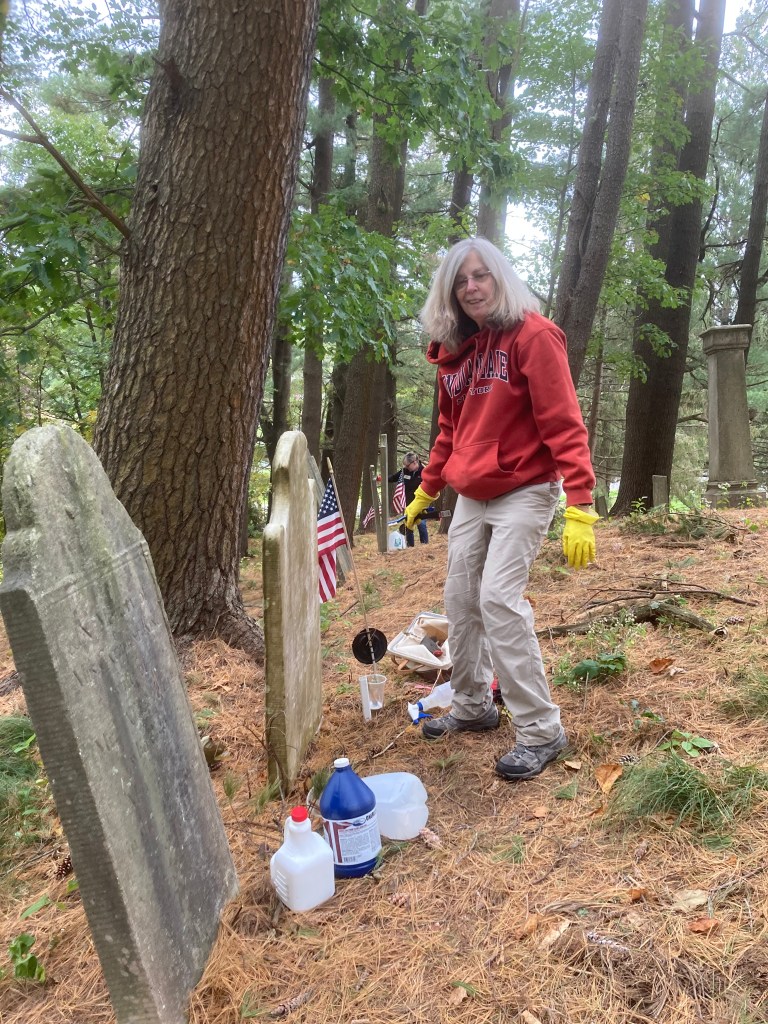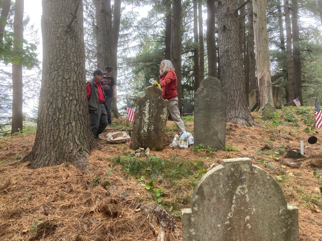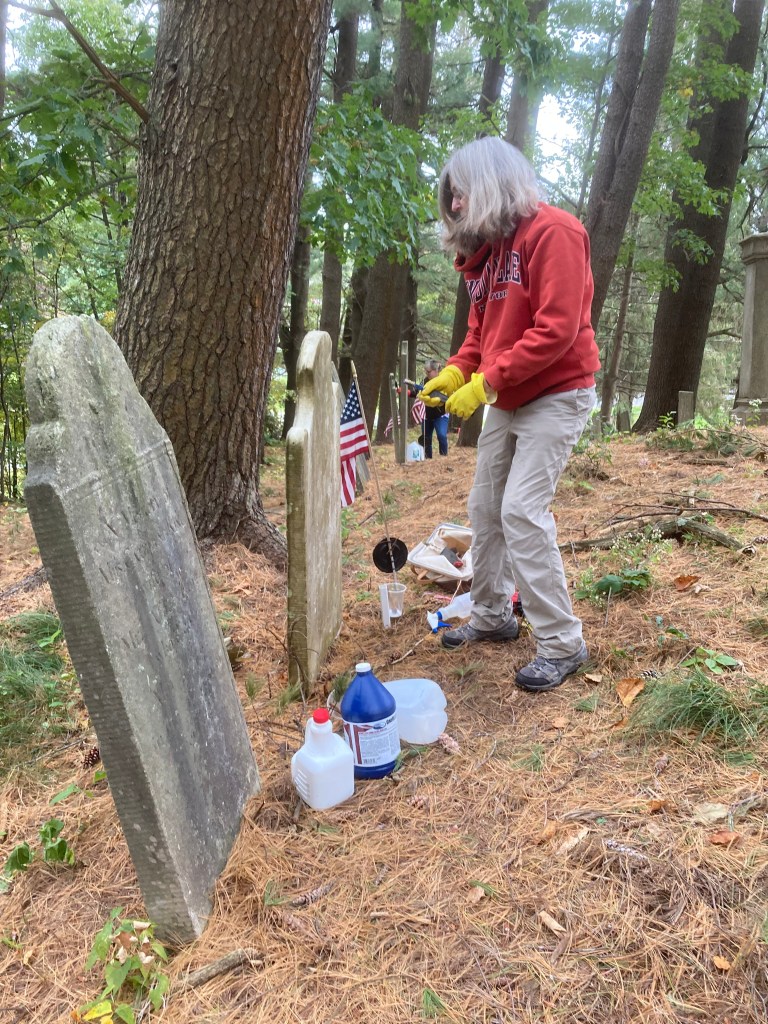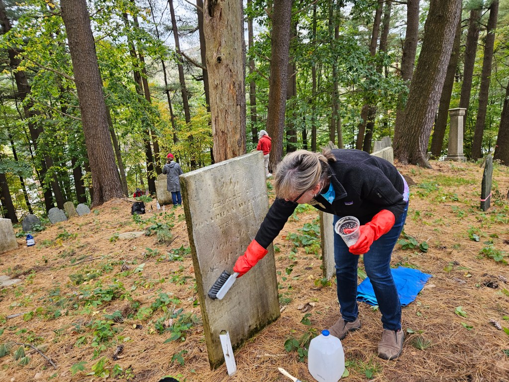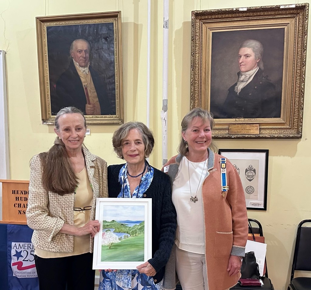 below: October 2023: DAR Day of Service at Cypress Hill Cemetery in New Lebanon; Hudson River School artist Laura Seymour’s descendant Lili Ott tours the chapter house with vice regent and regent; Frederic Church’s great-great granddaughter, a chapter member, presents the chapter a gift of her painting of the pond at Olana.