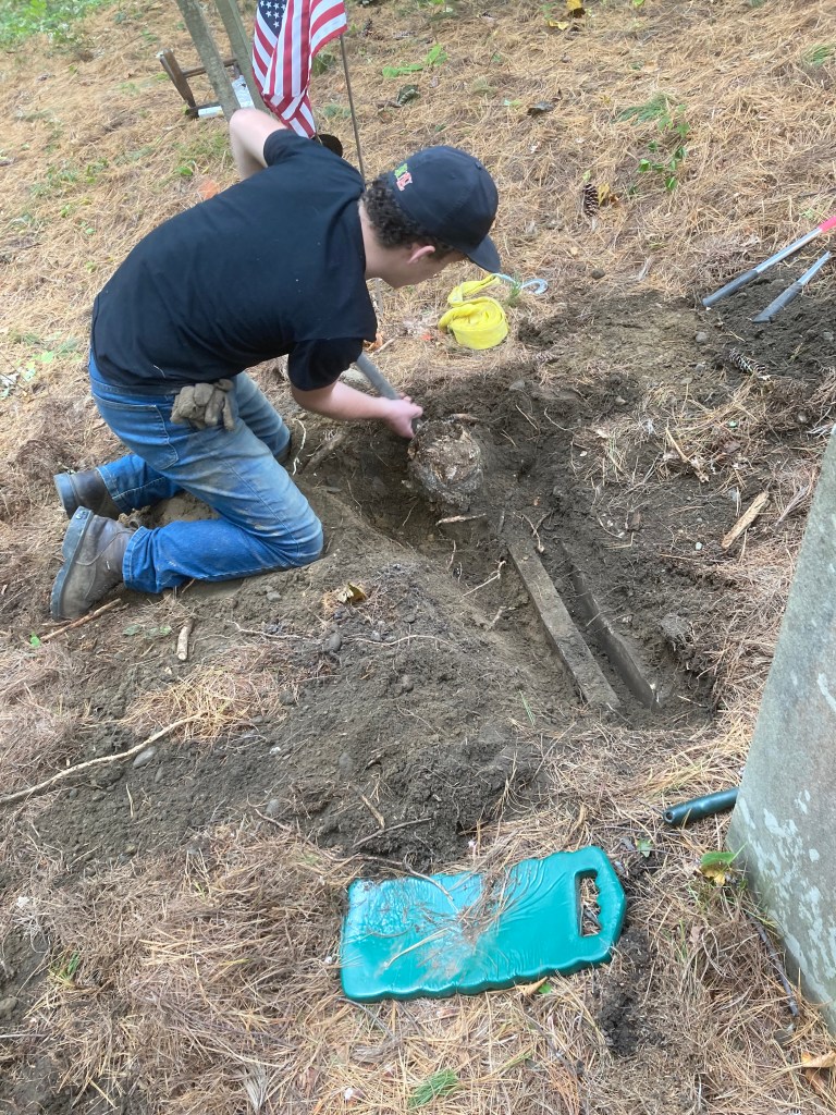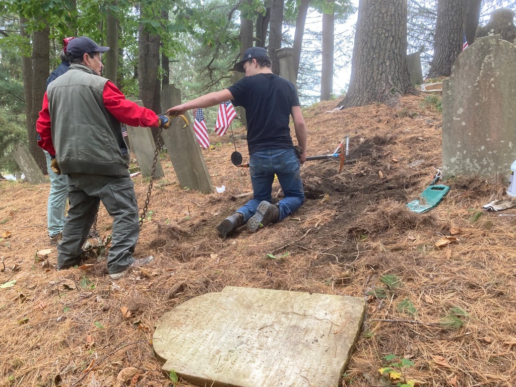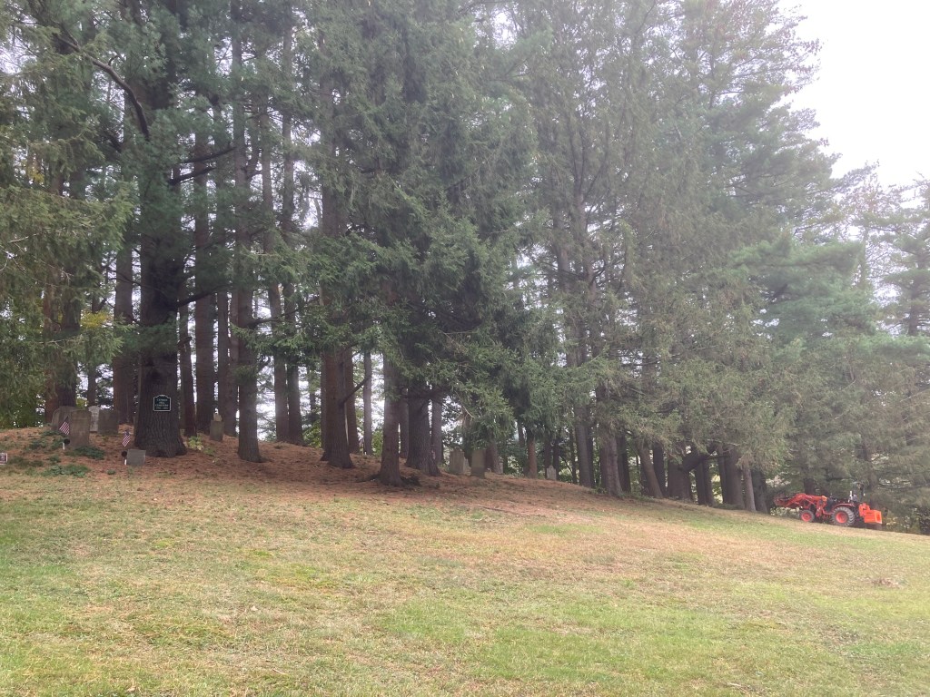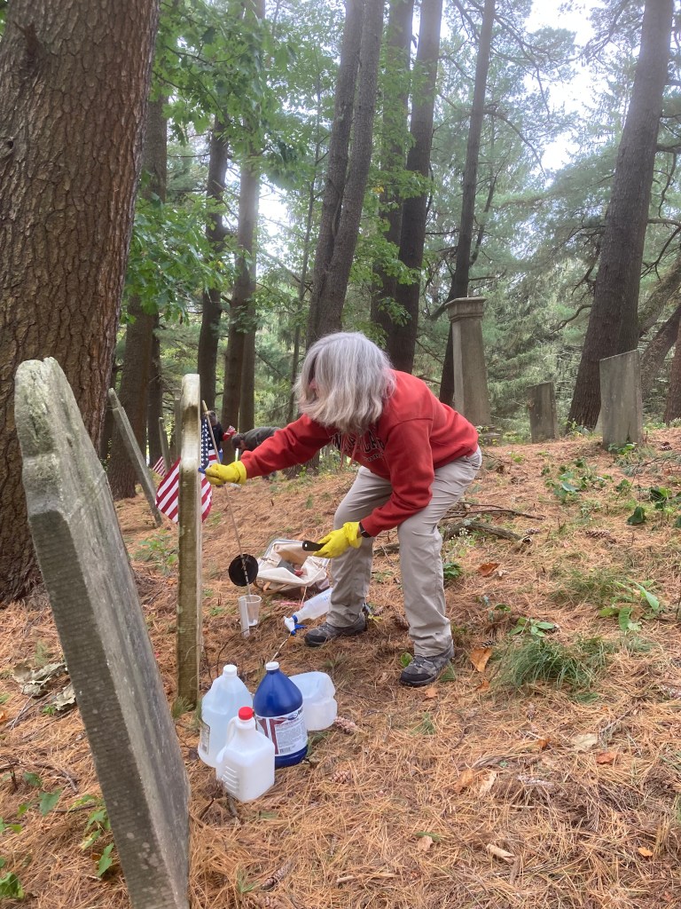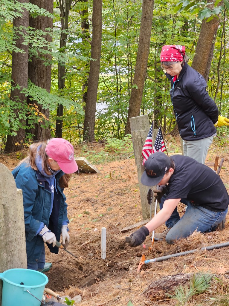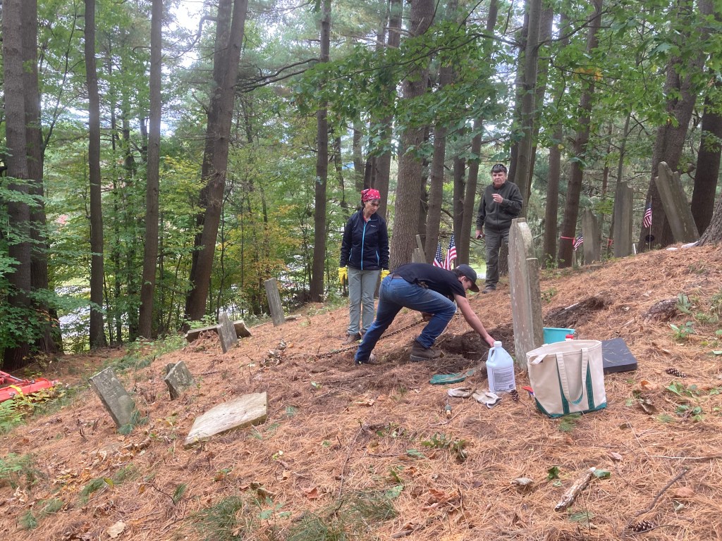 below: October 2023: DAR Day of Service at Cypress Hill Cemetery in New Lebanon; Hudson River School artist Laura Seymour’s descendant Lili Ott tours the chapter house with vice regent and regent; Frederic Church’s great-great granddaughter, a chapter member, presents the chapter a gift of her painting of the pond at Olana.