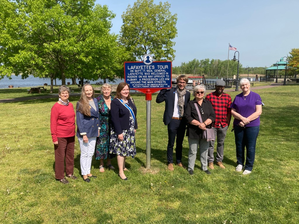 below: April-June 2023: Visit by Thomas Jenkins descendant Dodge Thompson and family, at Thomas Jenkins House, at Robert Jenkins House, at Plumb-Bronson House; dedication of Lafayette historical marker at the waterfront; Memorial Day services with former US Navy Senior Chief Petty Officer Malcolm Nance; Flag Day Luncheon with New York State Regent, featuring her Regent’s Project at the Saratoga National Historic Park as well as a major donation to our Capital Campaign.